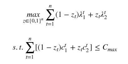 We introduce the decision variable $z_{t}, \forall t \in [1, n]$ such that $z_{t} = 0$ if the supplier chooses $M_{1}$ , $z_{t} = 1$ if choose $M_{2}$, with every possible vector $z = [z_{1}, ..., z_{n}]$ being a possible schedule. The previously formulated problem can then be expressed as: